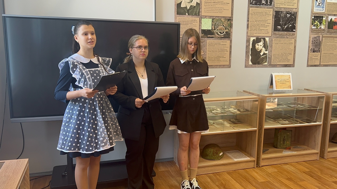 Наша пионерская дружина долгое время носила имя А.Морозовой. Подвигу этой девушки у нас посвящено 3 стенда.